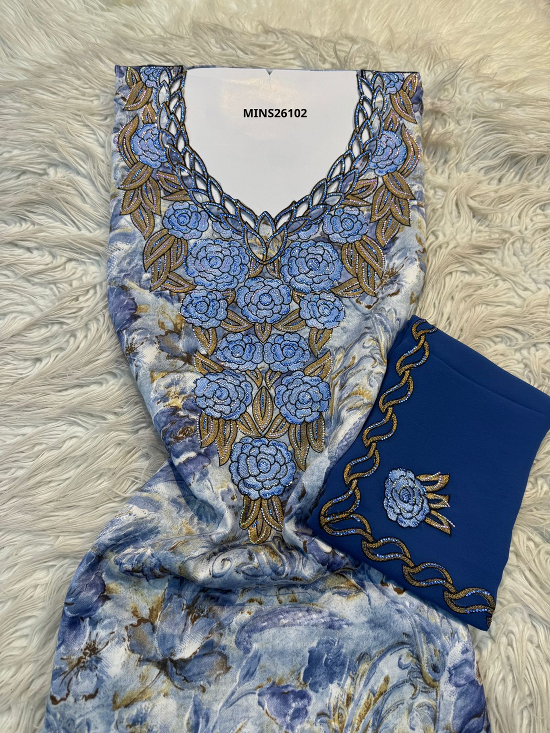 قماش مخور إندونيسي أزرق مطرز مع شيلة MINS26102