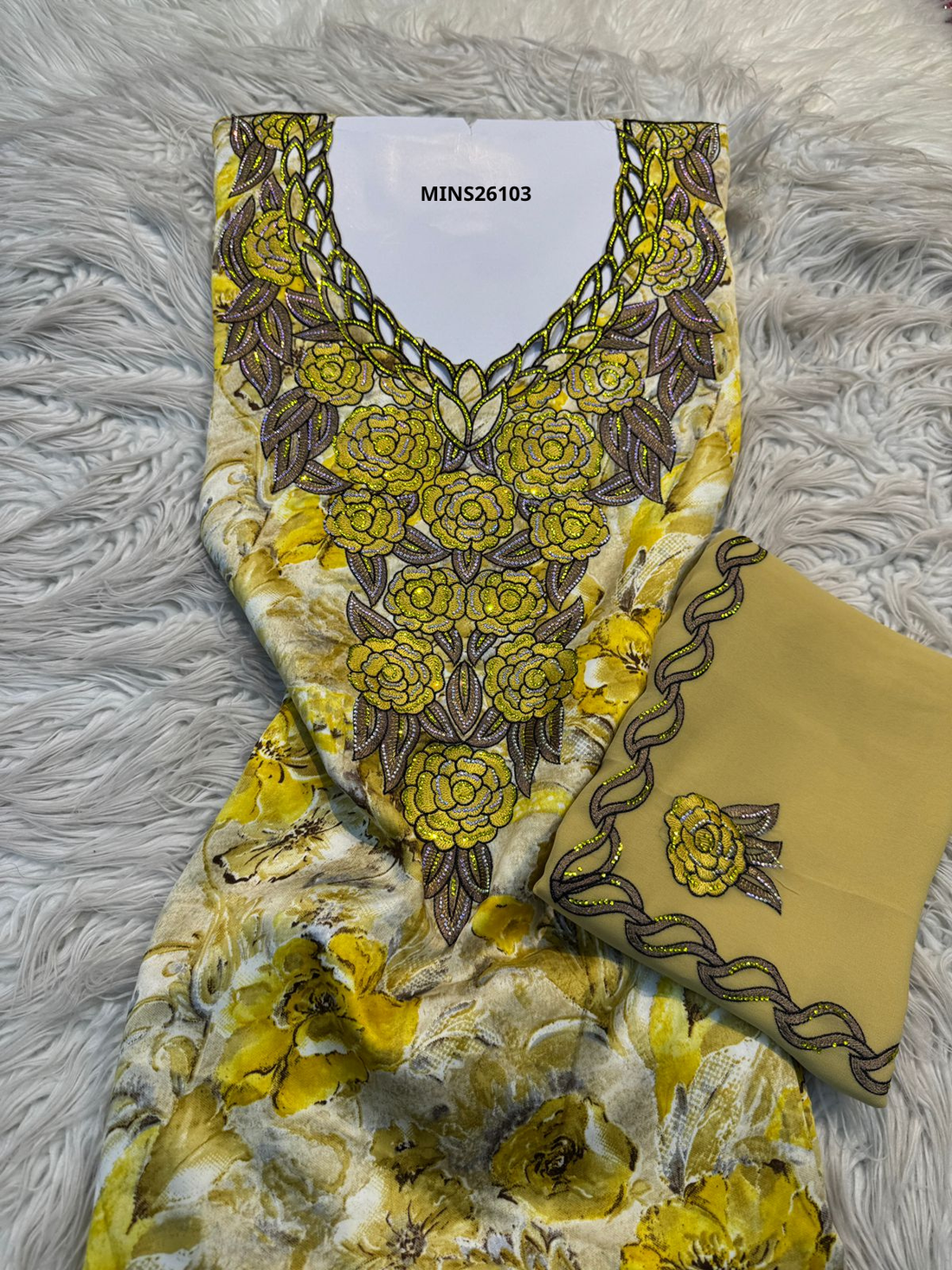 قماش مخور إندونيسي أصفر مطرز مع شيلة MINS26103