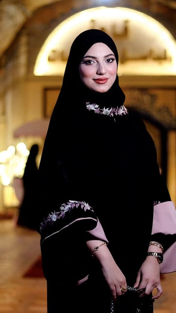 عباية حرير ندى سوداء بتطريز وردي جانبي وأكمام واسعة AB2601