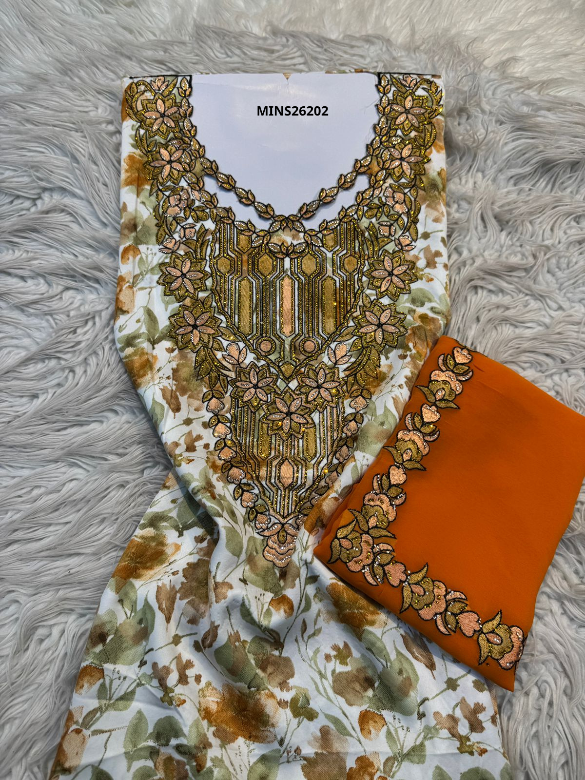 قماش مخور إندونيسي بدرجات البرتقالي والزيتي مطرز مع شيلة - MINS26202