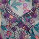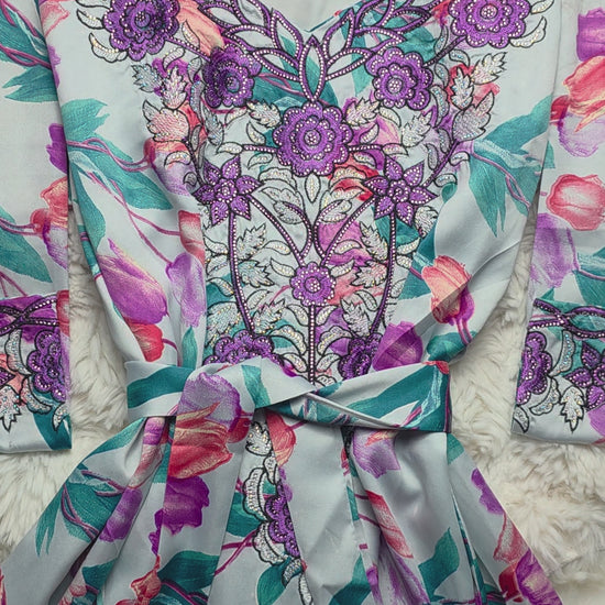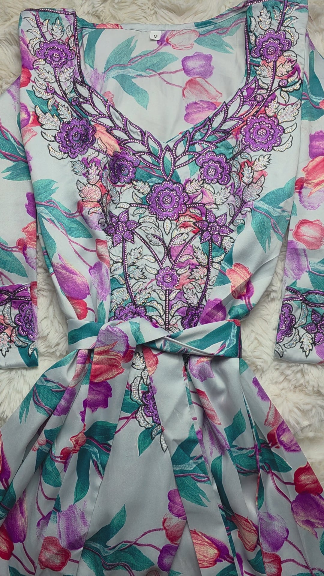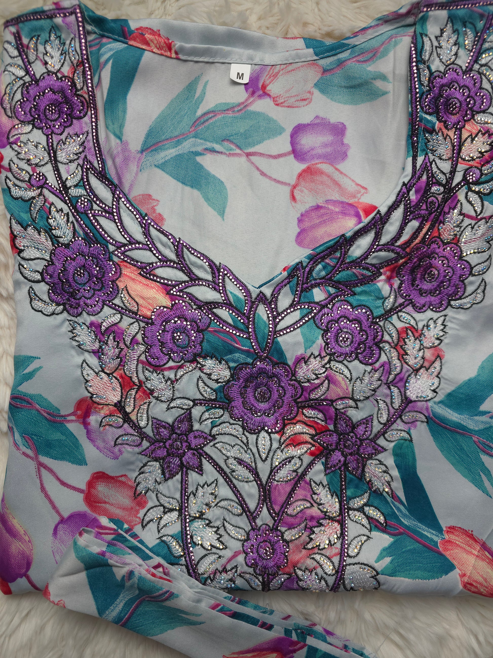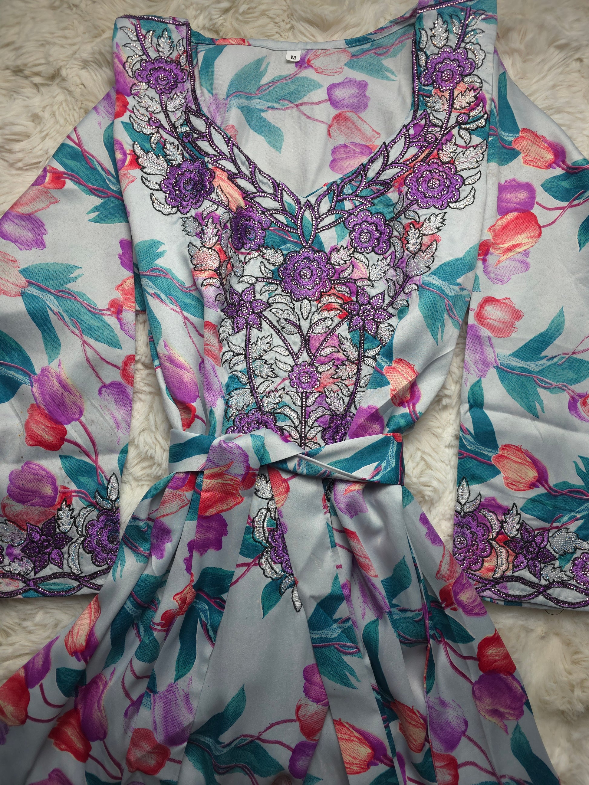 أرضية بلون فاتح ناعم مع تدرجات زهري وأخضر تركواز، يتوسطها تطريز بنفسجي ملكي مع فضي لامع يمنح القطعة فخامة واضحة تحت الإضاءة.