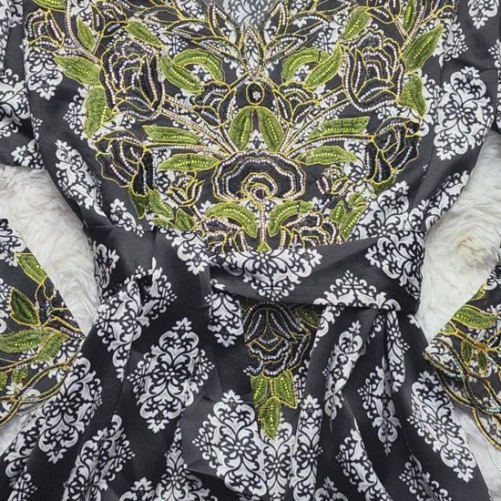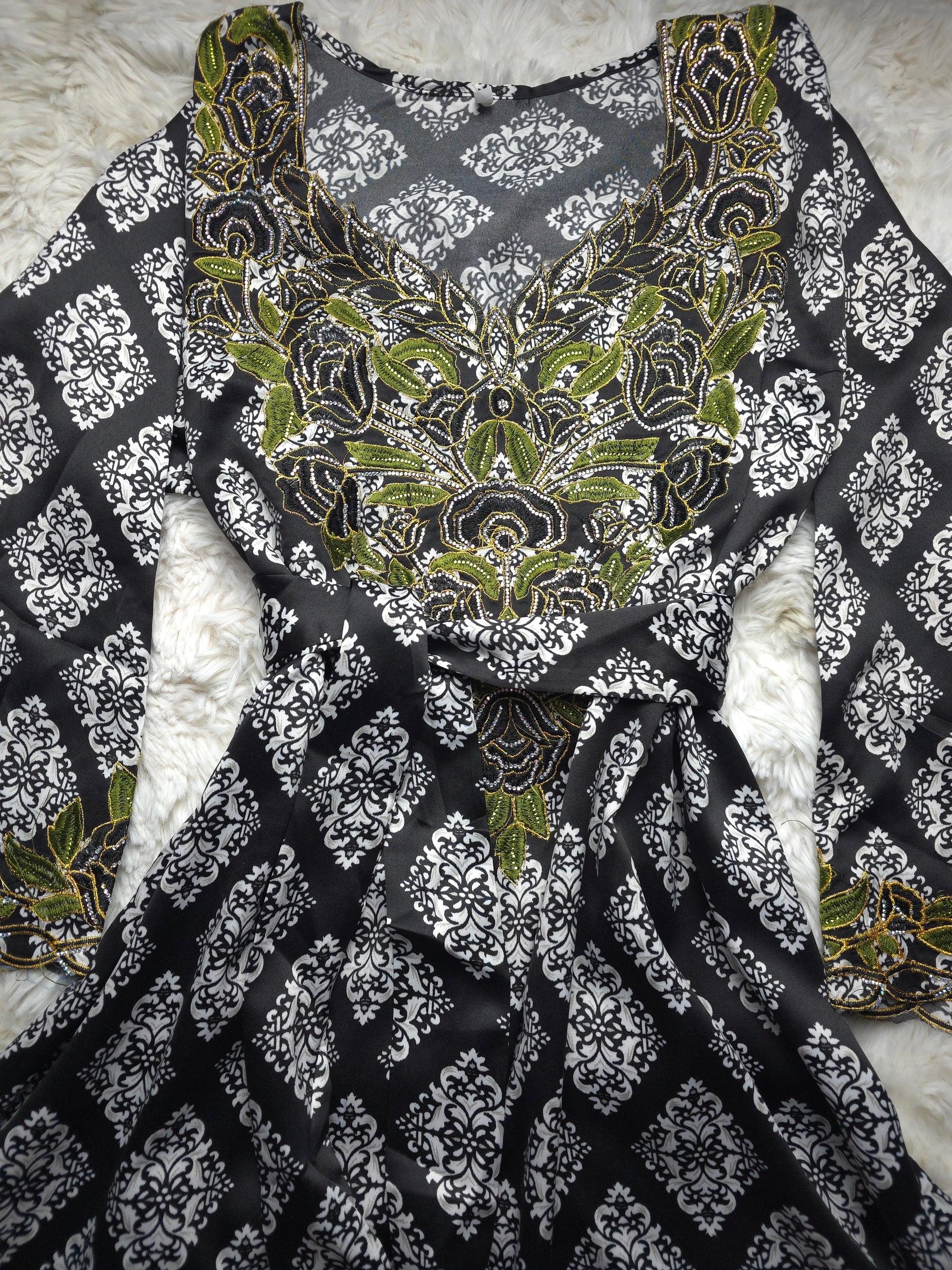 النقشة: زخارف راقية موزعة بانسجام على كامل القطعة، مع تطريز فاخر ومكثف على الصدر والأكمام يبرز جمال التصميم ويمنحه طابعًا فخمًا ومميزًا.