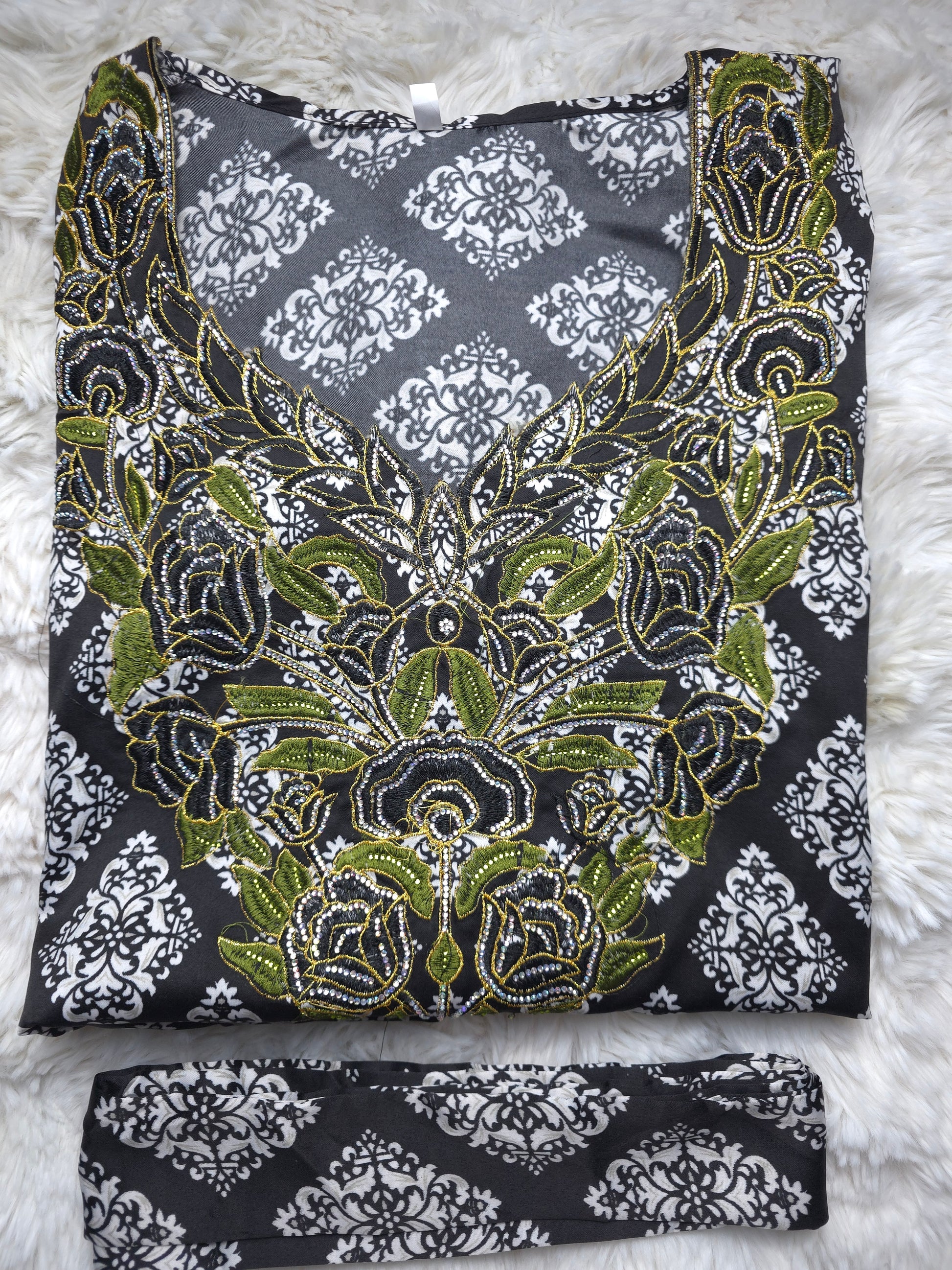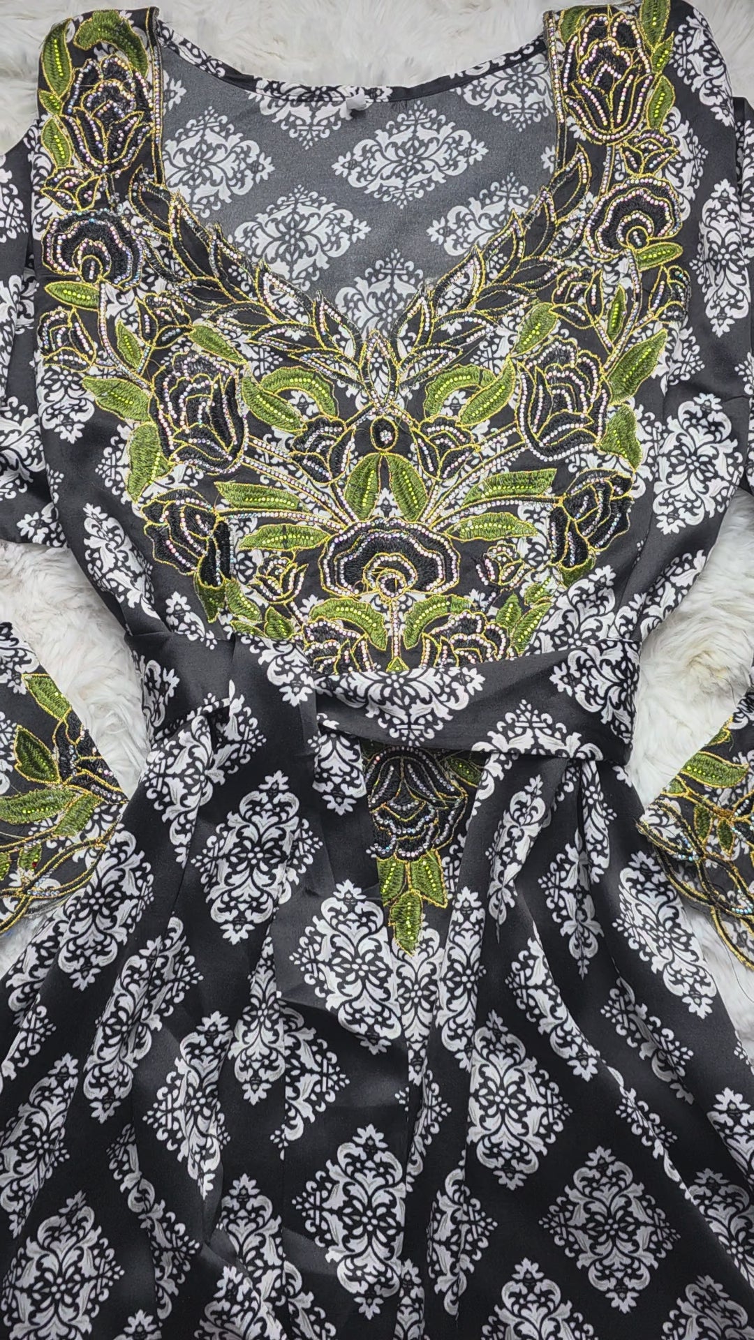 الألوان: أسود كلاسيكي بنقشة بيضاء فاخرة، مع تطريز أخضر ملكي ولمسات دقيقة تزيده تميزًا وأناقة.