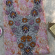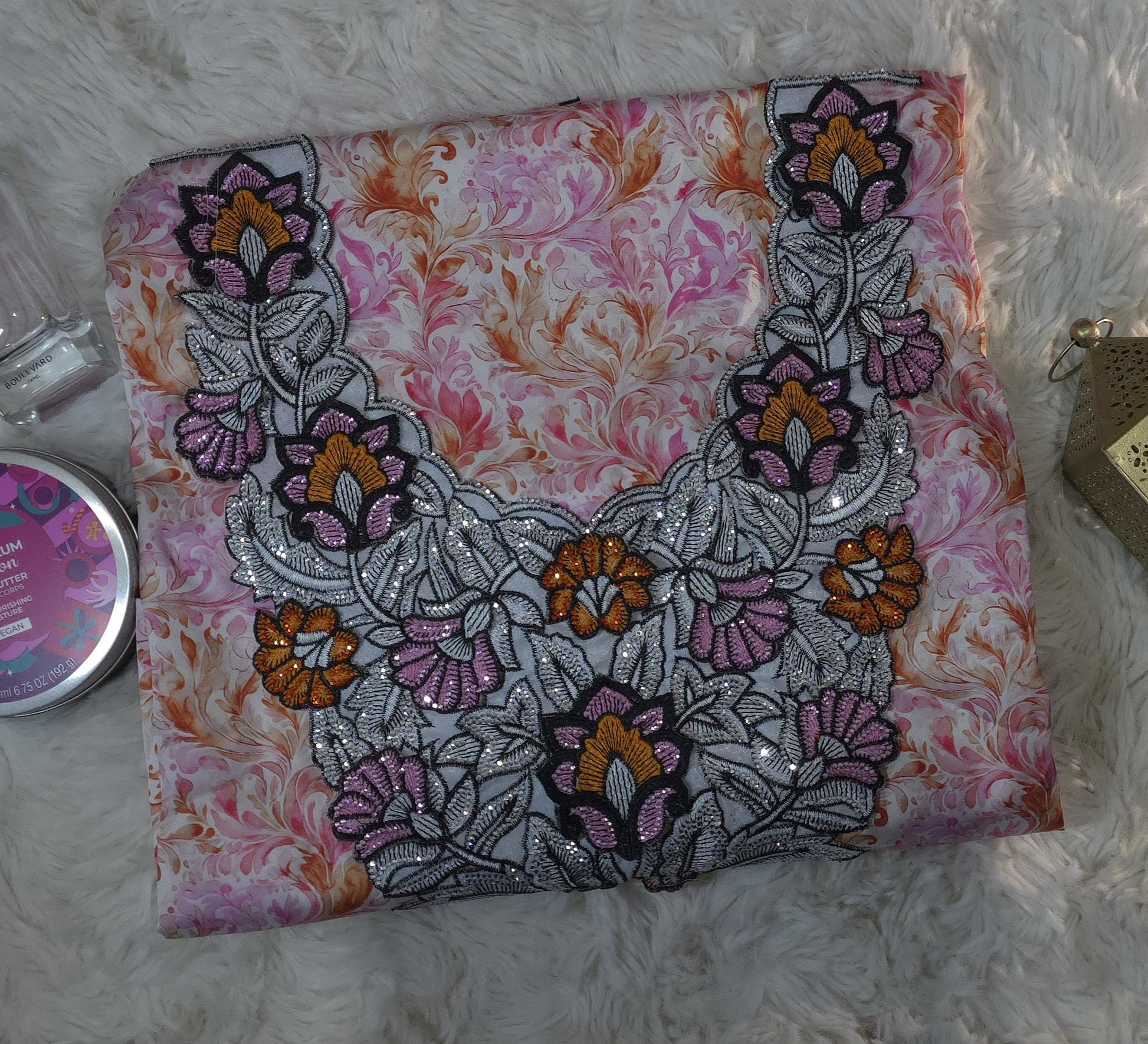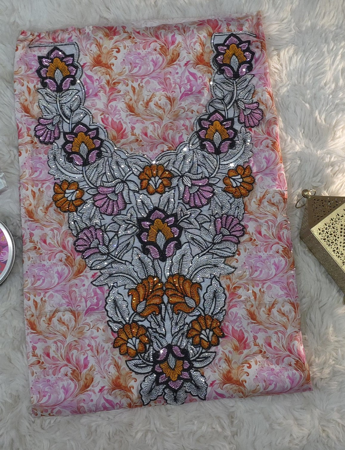 يأتي القماش بنقشة زخرفية أنيقة بدرجات الوردي مع لمسات برتقالية دافئة، إضافة إلى تطريز فاخر متعدد الألوان يبرز جمال التصميم ويمنحه طابعًا مميزًا.