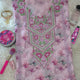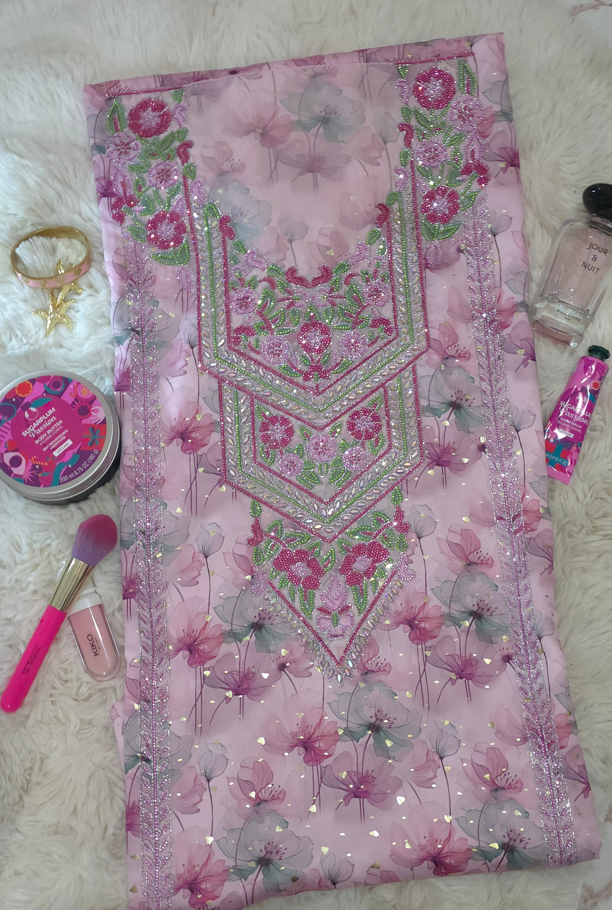 التطريز الأمامي يأتي على شكل لوحة زخرفية متماثلة حول الصدر، ويتكون من زهور وأوراق مطرزة بالخرز والكريستال بدرجات الوردي والأخضر والفضي، مع تفاصيل دقيقة تعطي تأثيرًا ثلاثي الأبعاد يبرز جمال النقشة ويمنح القماش طابعًا فاخرًا.