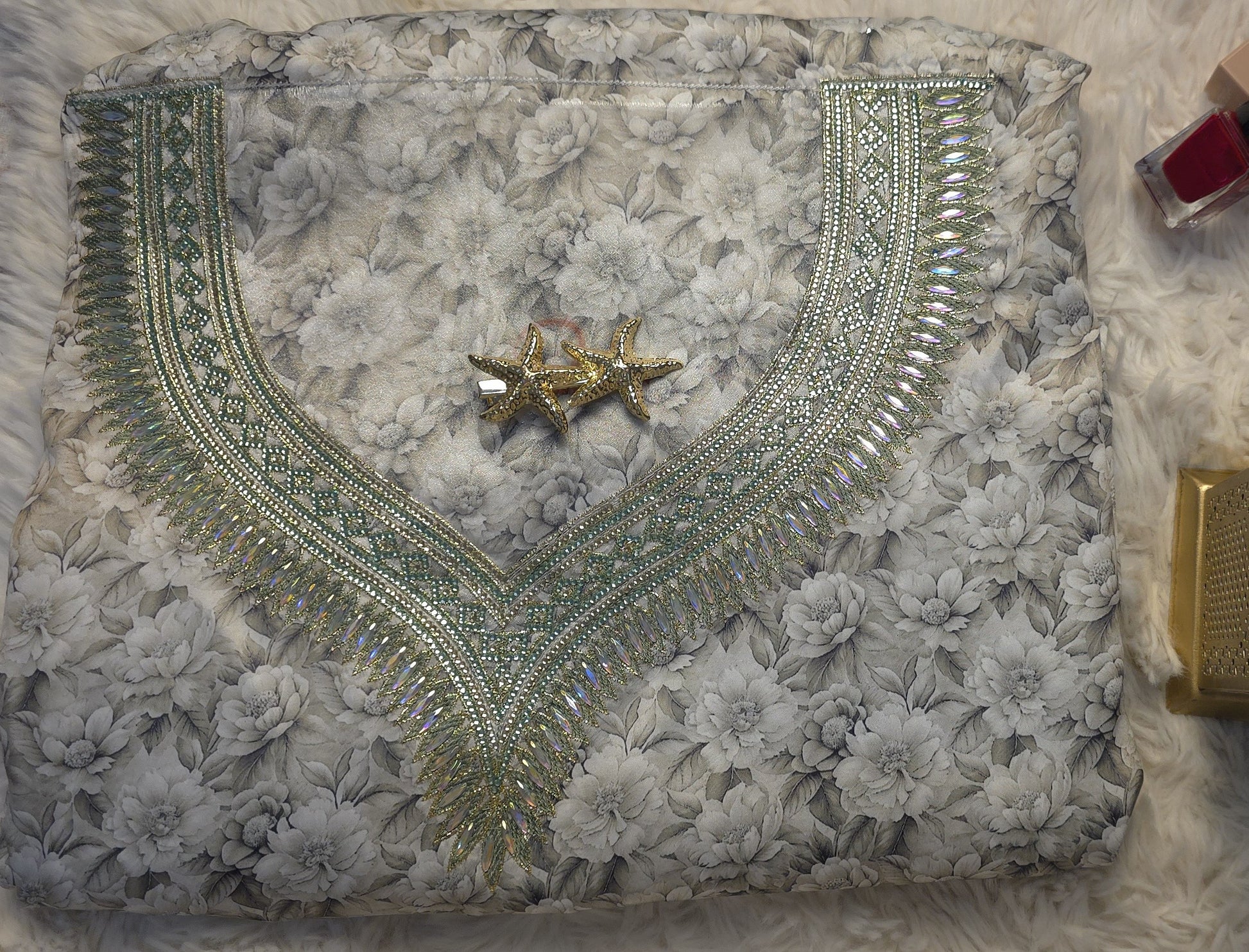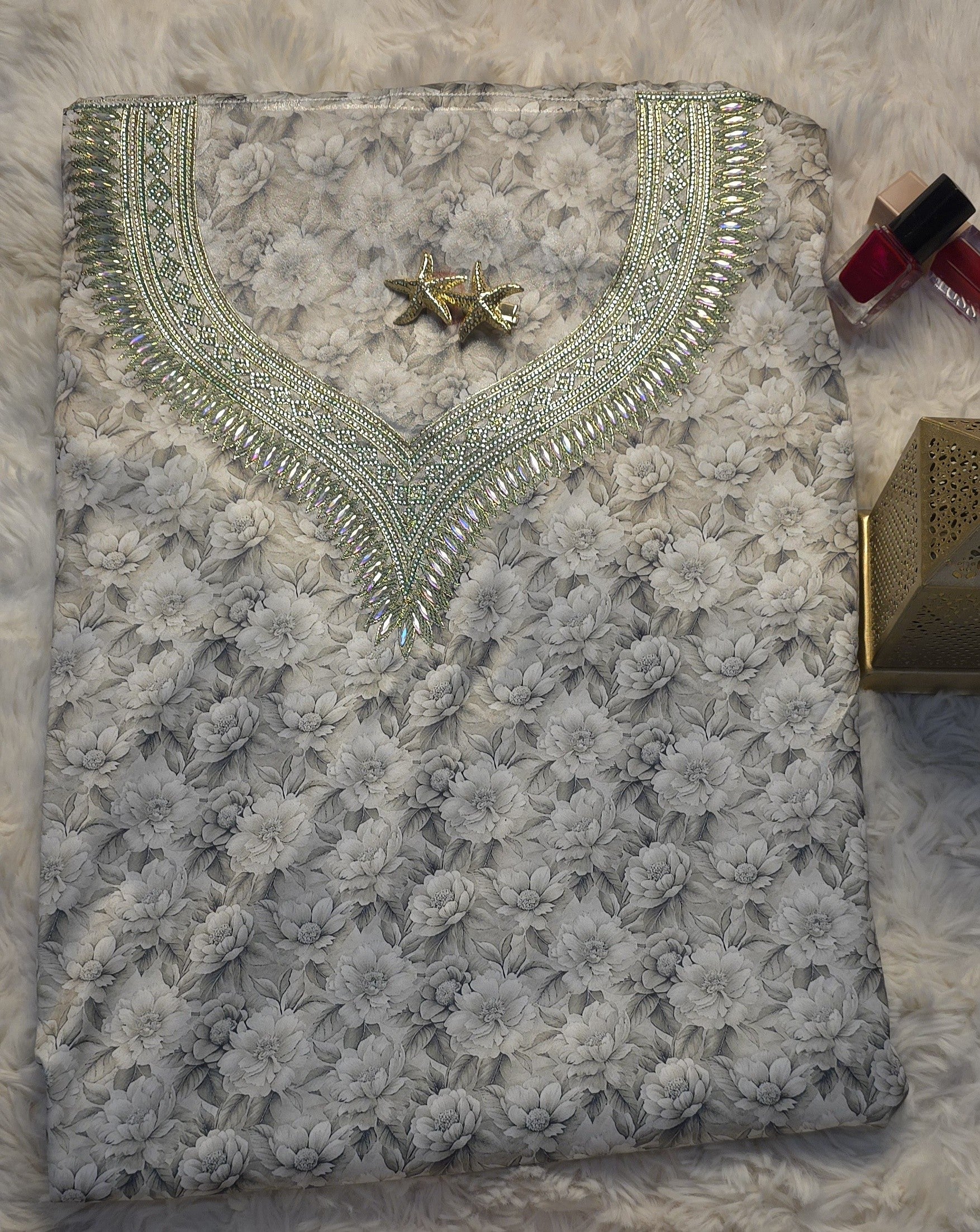 التصميم يجمع بين الخلفية الزهرية الرمادية الهادئة والتطريز الكريستالي اللامع ليمنح القماش مظهراً أنيقاً ومتوازناً مناسباً لتفصيل مخور فاخر.