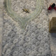 يتصدر القماش تطريز صدر أنيق على شكل ياقة حرف V عريضة، مزينة بصفوف دقيقة من الكريستال اللامع والخرز الصغير المرتب بعناية ليشكل إطاراً زخرفياً فاخراً حول منطقة الصدر. تظهر في التطريز قطع كريستال طويلة تعكس الضوء بلمعة راقية تضيف فخامة للتصميم دون أن تطغى على هدوء النقشة الزهرية في الخلفية.