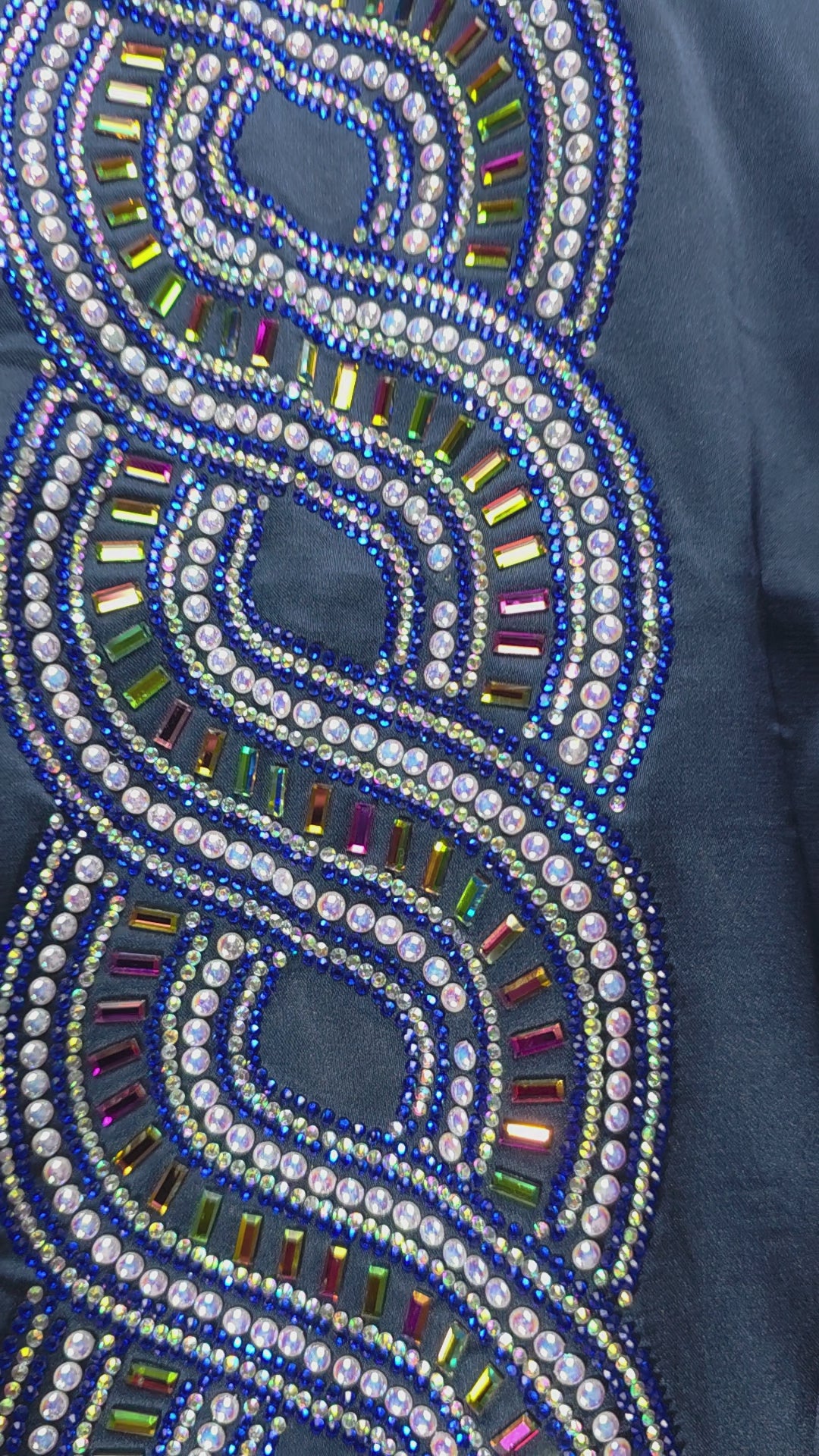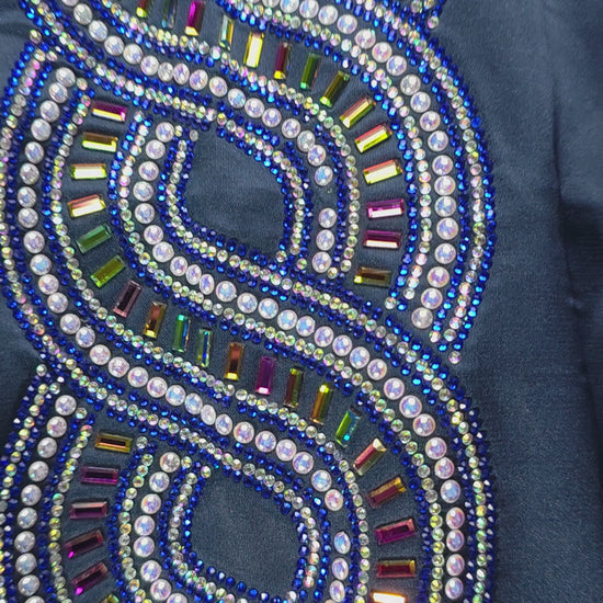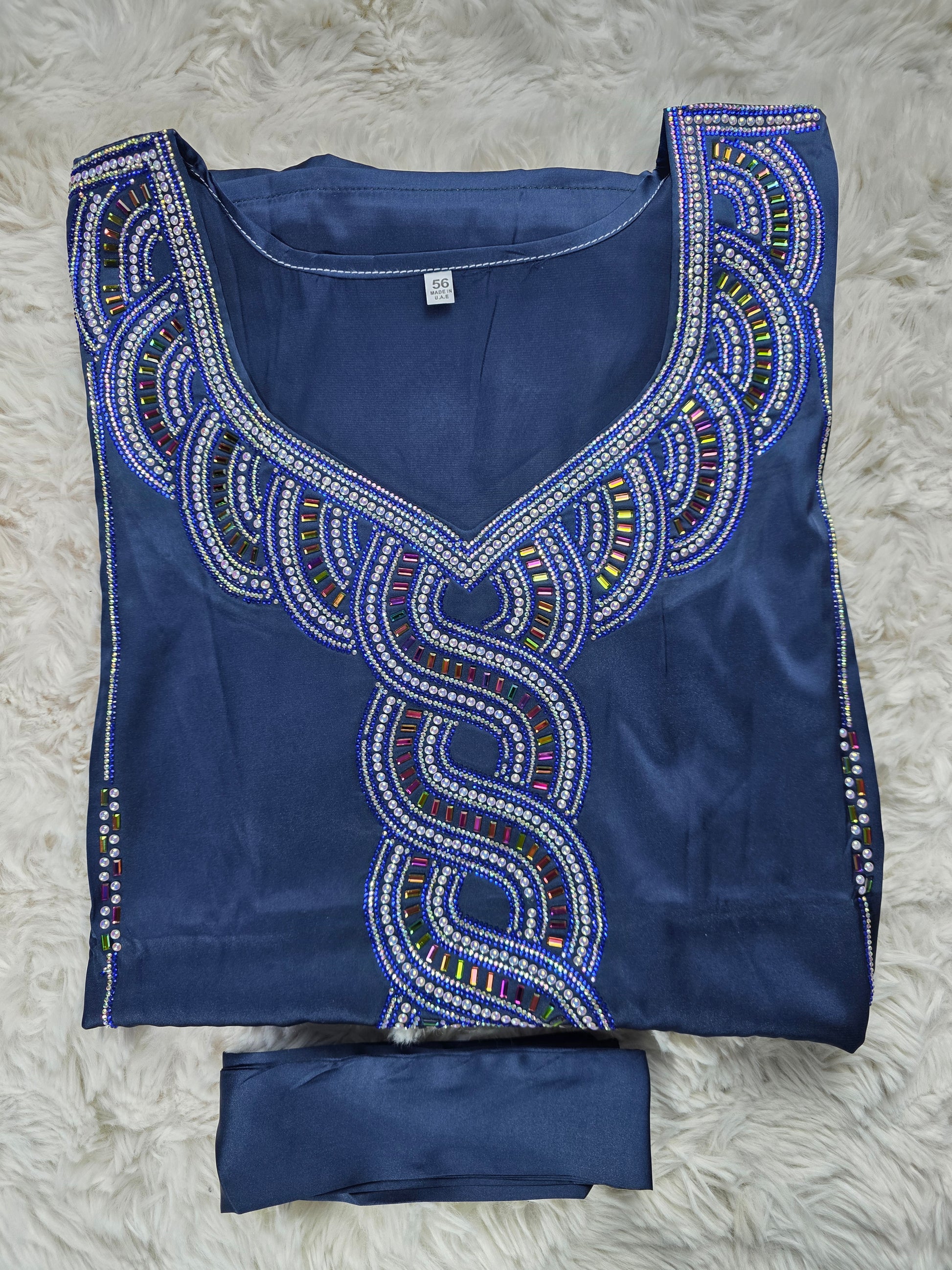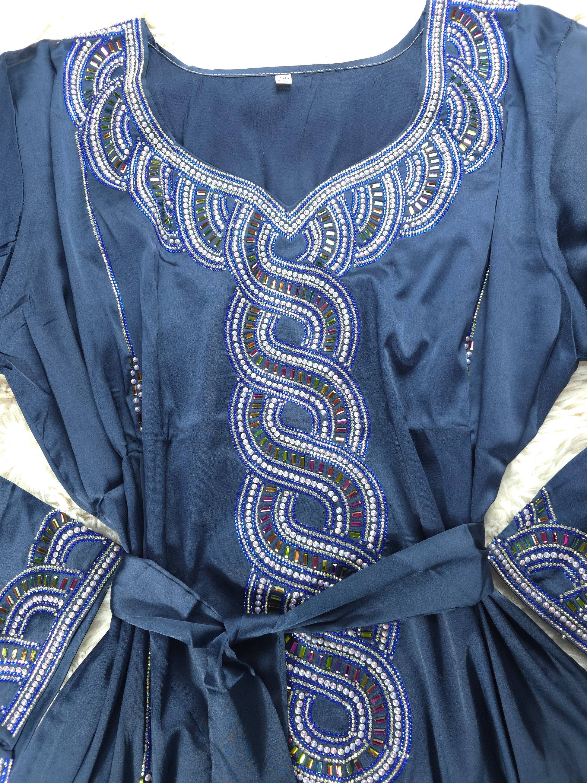 كحلي أنيق مع تطريز بدرجات الأزرق والفضي ولمسات متعددة الألوان تعكس الضوء وتضيف فخامة للتصميم.