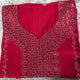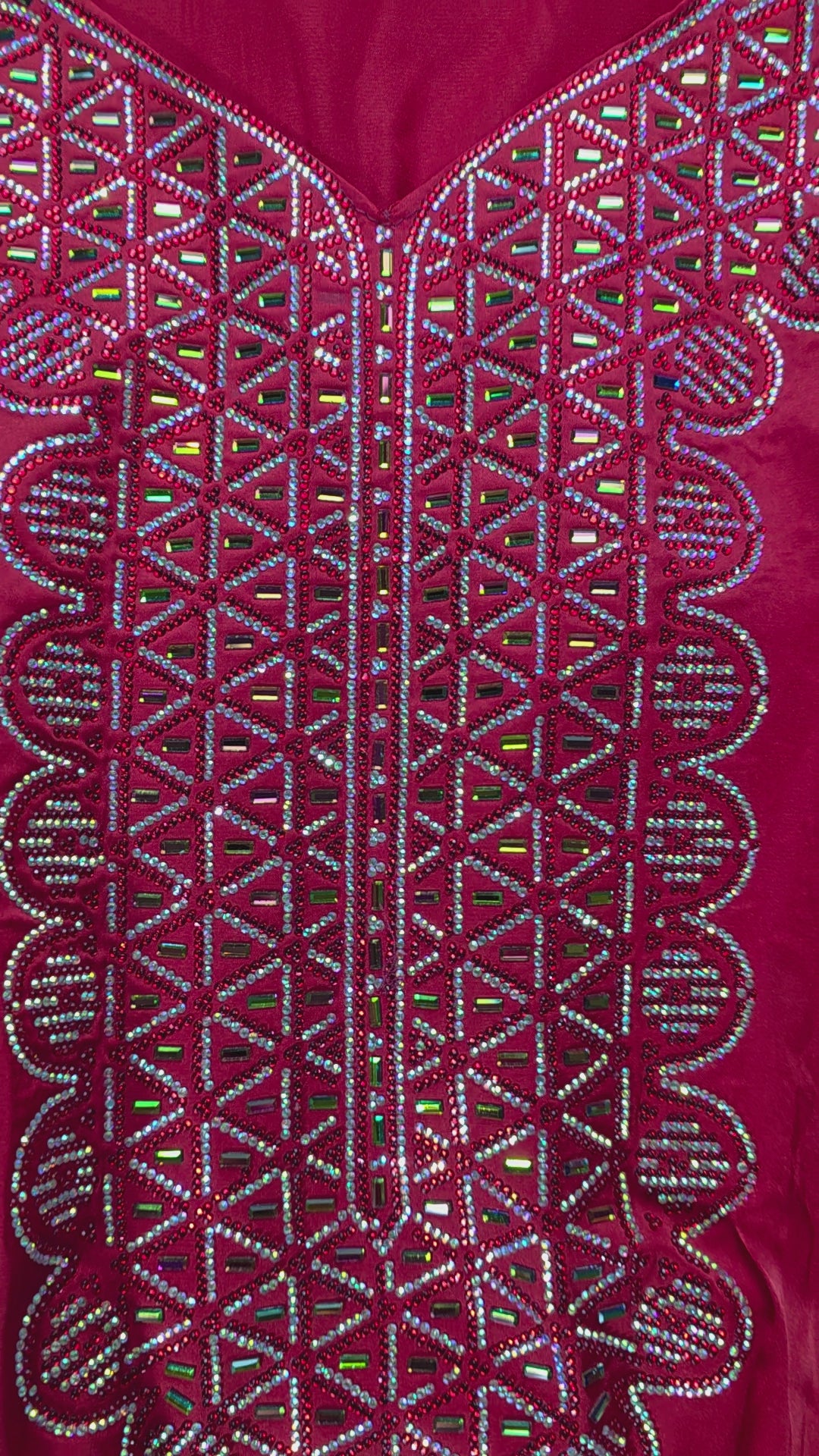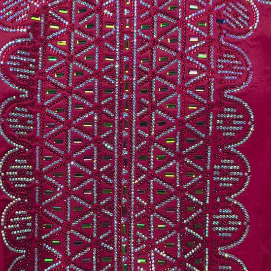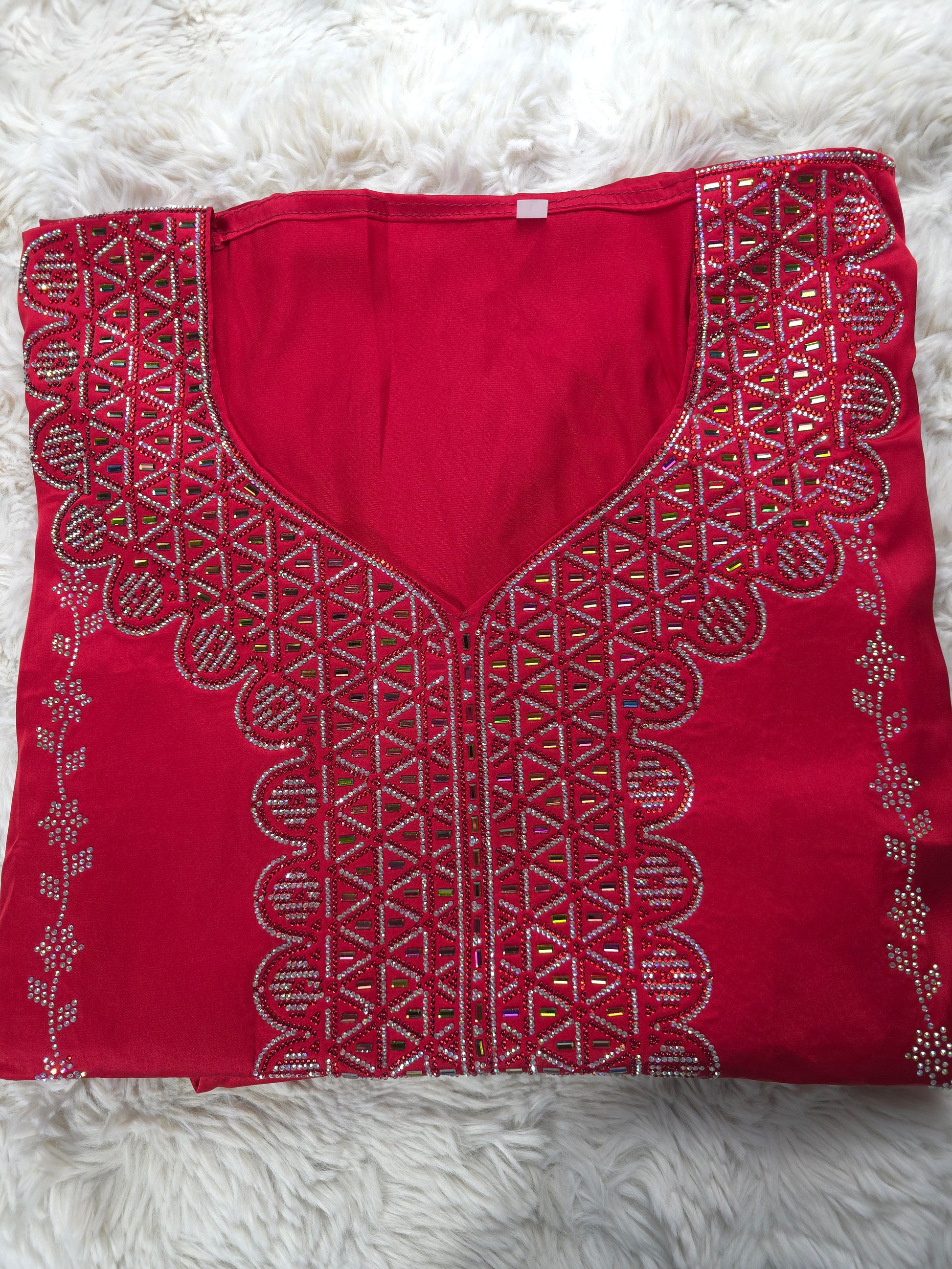أحمر ملكي غني مع تطريز لامع بدرجات فضية ولمسات كريستالية تعكس الضوء وتمنح القطعة مظهرًا فخمًا وجذابًا.