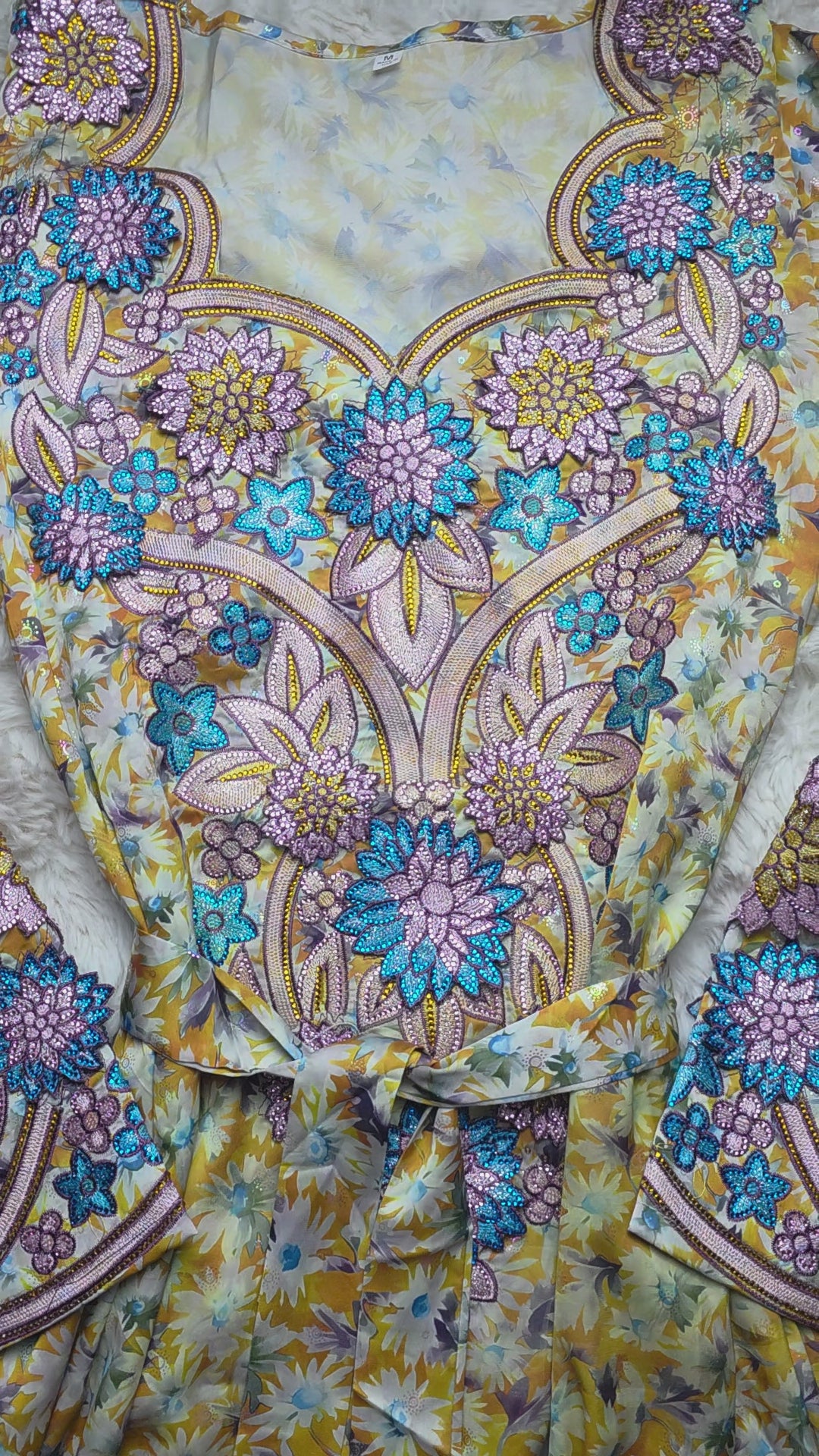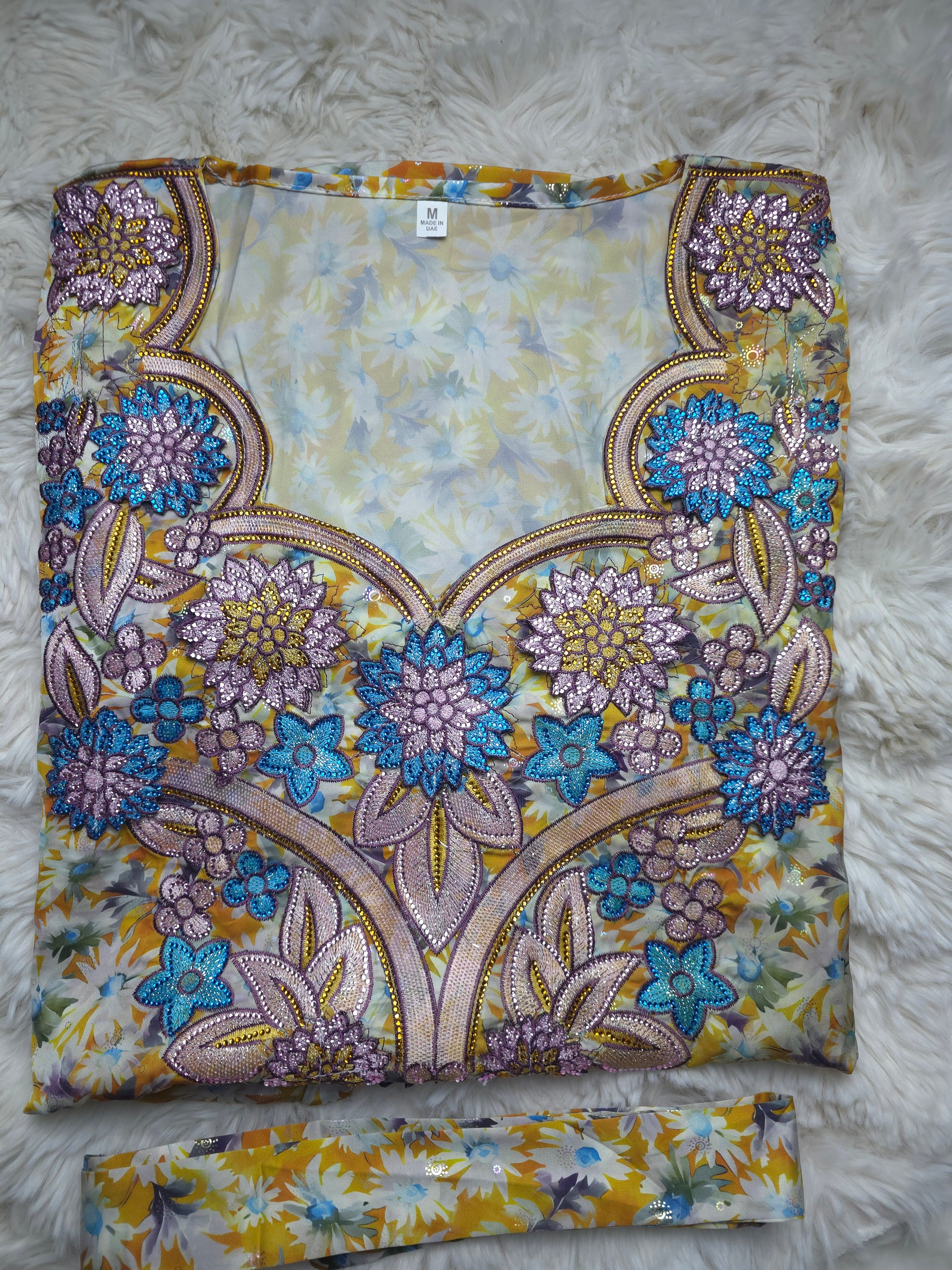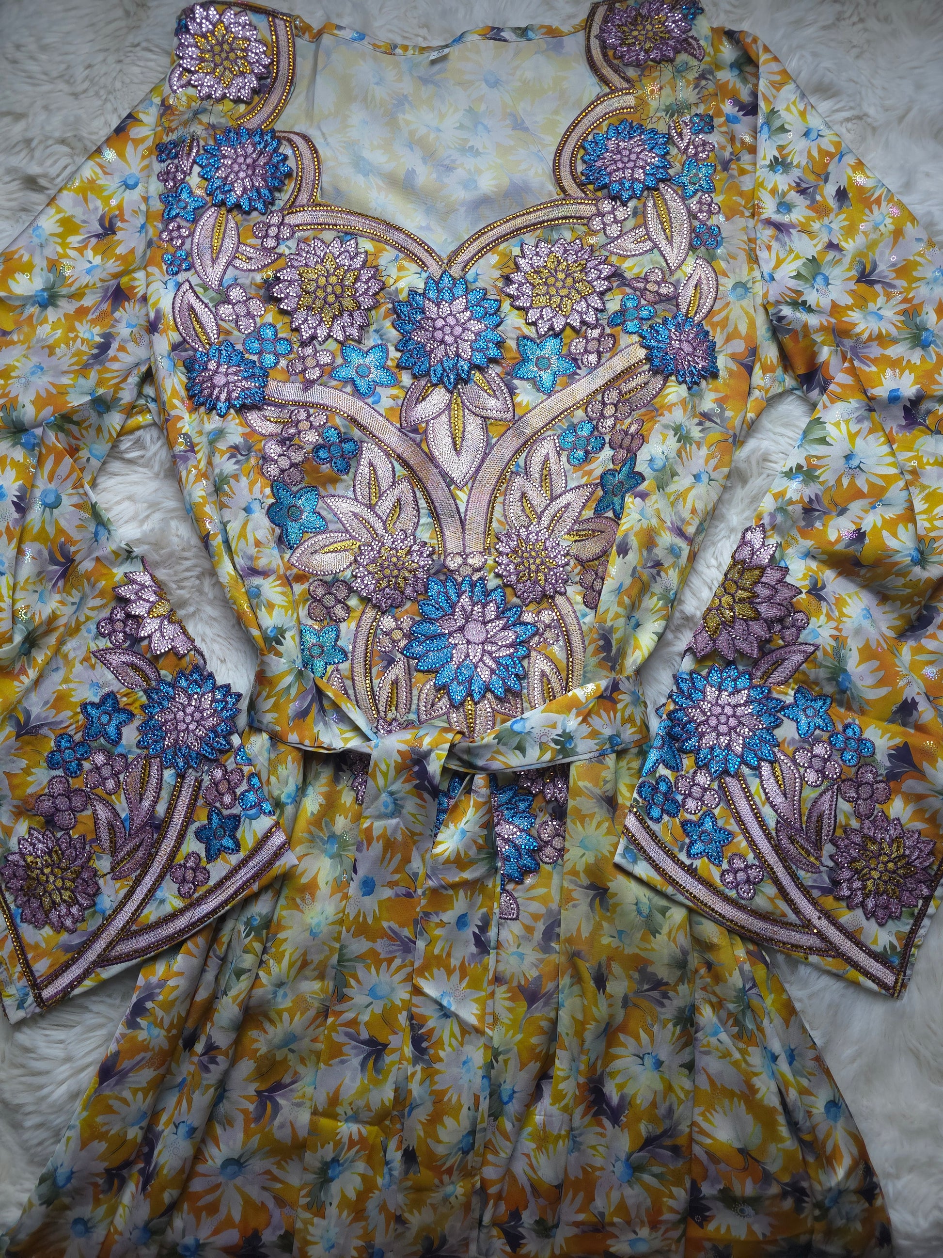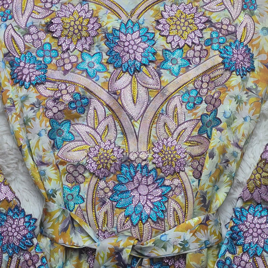 أصفر ذهبي مع نقشة زهور متعددة الألوان ولمسات أزرق سماوي وبنفسجي مع تطريز بارز بدرجات الأزرق والليلكي والذهبي.